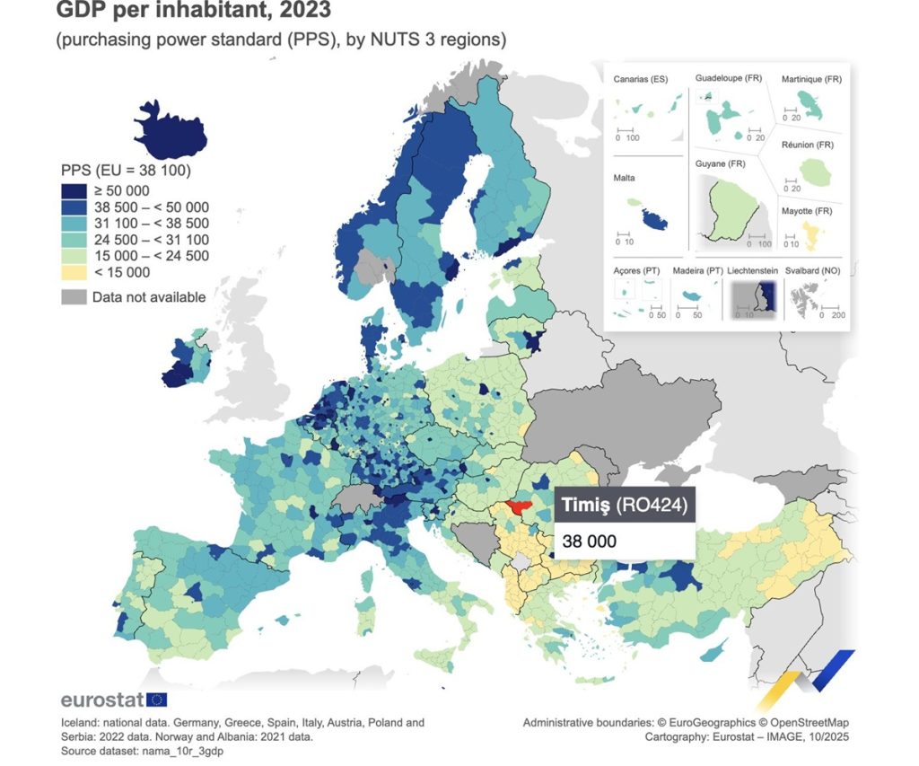 Datele Eurostat prezintă pentru economia județului Timiș o situație mai mult decât excelentă, cu un rezultat de 99,74% din media Uniunii Europene la PIB/locuitor, raportat la Puterea de Cumpărare (PPS), cu o valoare de aproximativ 38.000 PPS, foarte aproape de media UE de 38.100 PPS. Datele au fost făcute publice la finalul lunii octombrie a anului precedent. Chiar și așa, Timișul nu e cel mai ”tare” județ, bătălia cu veșnicul adversar, Clujul, este pierdută și de această dată.