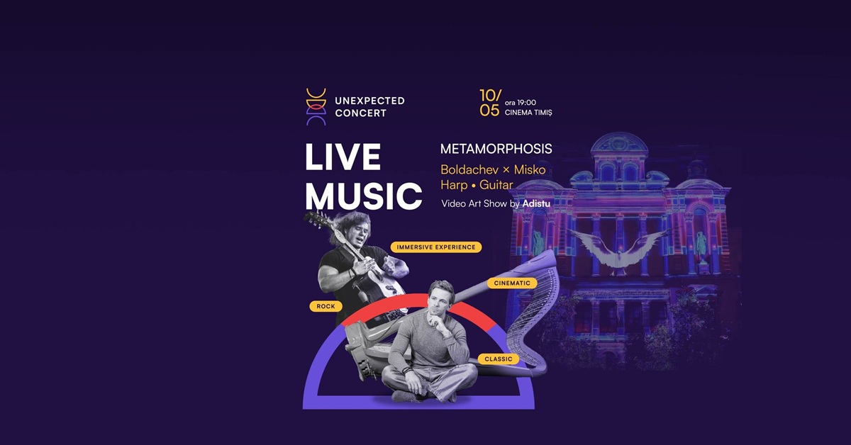 Harpistul Alexander Boldachev și chitaristul Alex Misko se vor afla duminică, 10 mai 2026, de la ora 19,00, la Timișoara, într-un spectacol de muzică special, care va aduce muzica live, storytelling-ul și arta vizuală pe scena Cinema Timiș.